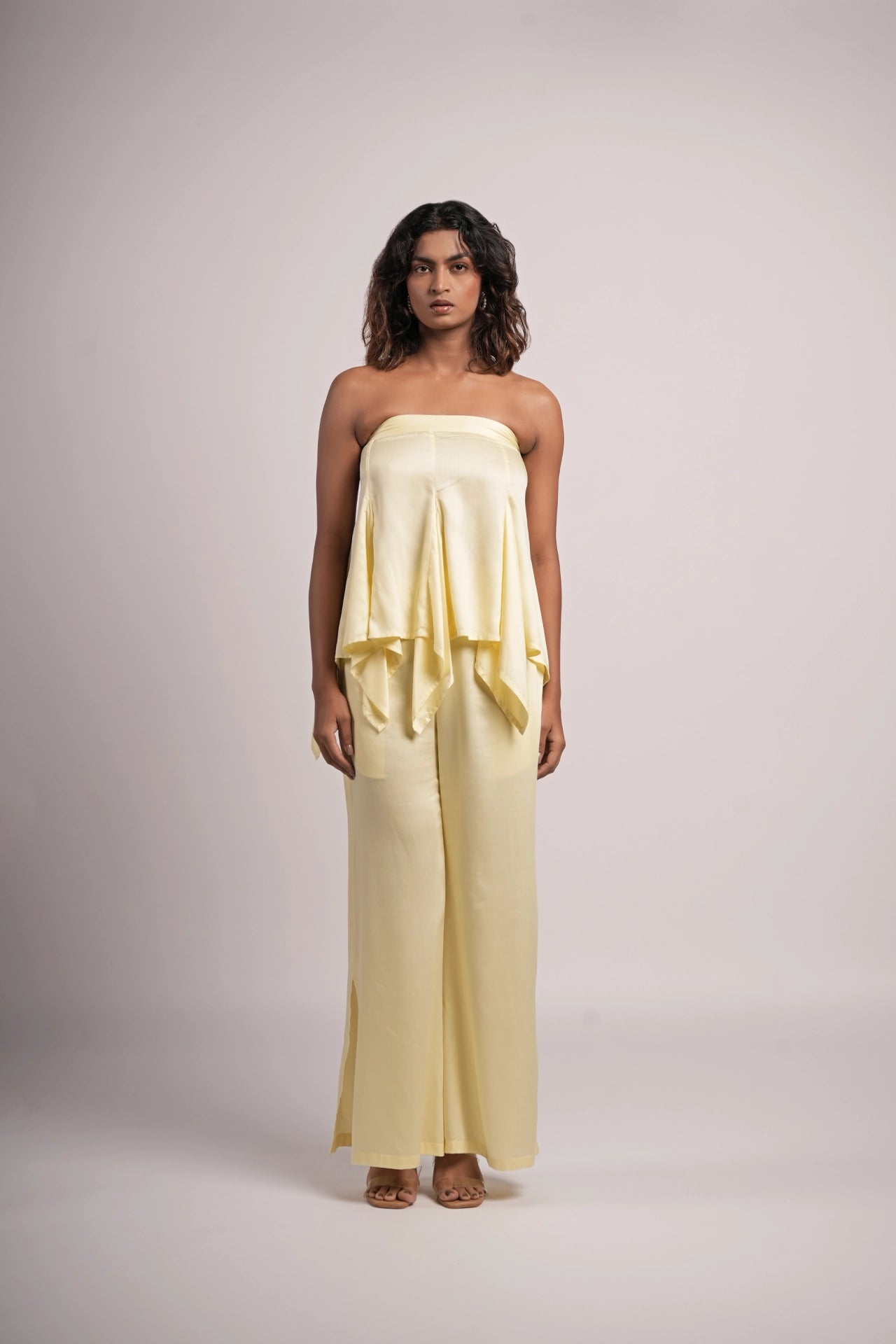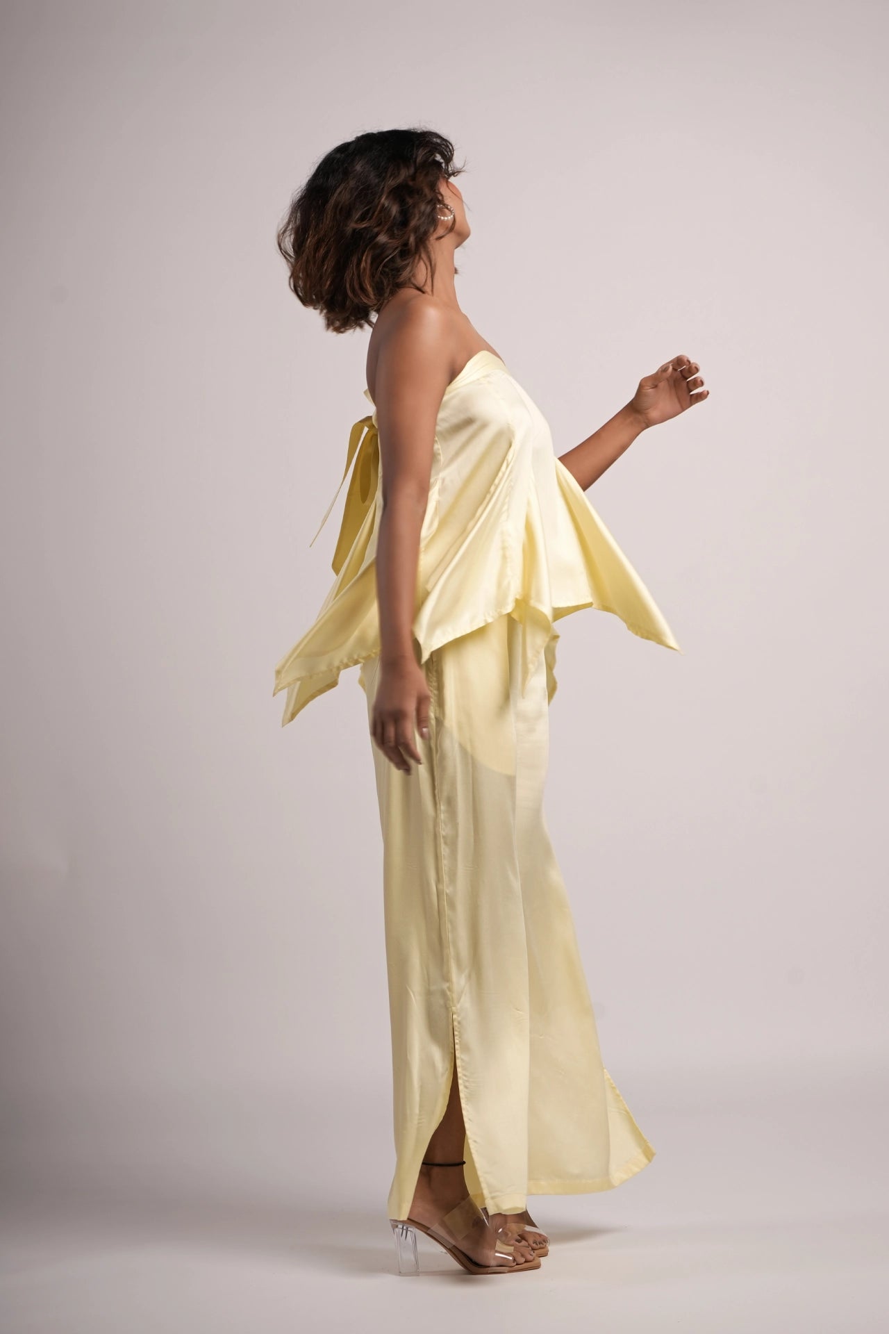 Design: Strapless silhouette with a fluid, handkerchief-style hem